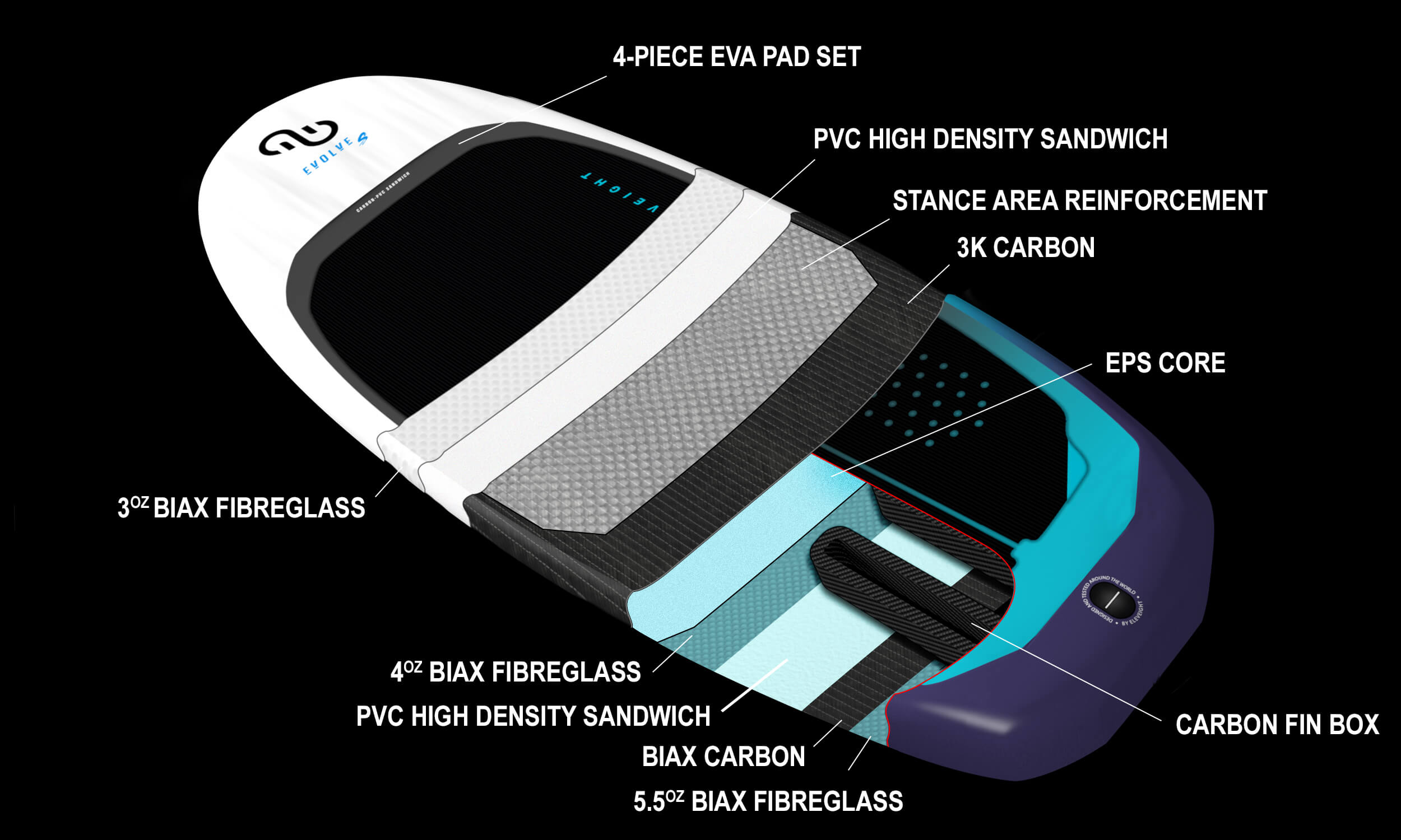 | Board size | 5'0" / 75L, 5'1" / 85L, 5'2" / 95L, 5'8" / 125L |